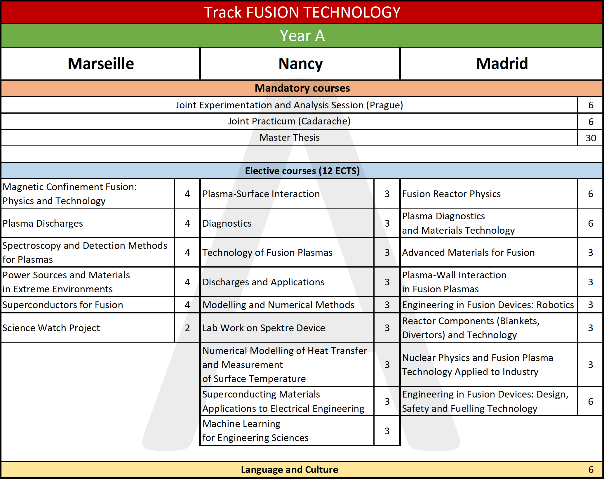 Starting from the academic year 2025-2026, students will choose between two tracks: Fusion Science or Fusion Technology. In both master years, they then study at a site where their chosen track is offered (see below) and take elective courses from that track. Hence, the programme offers plenty of room for personal interests, based a sufficiently broad, solid foundation of general courses.